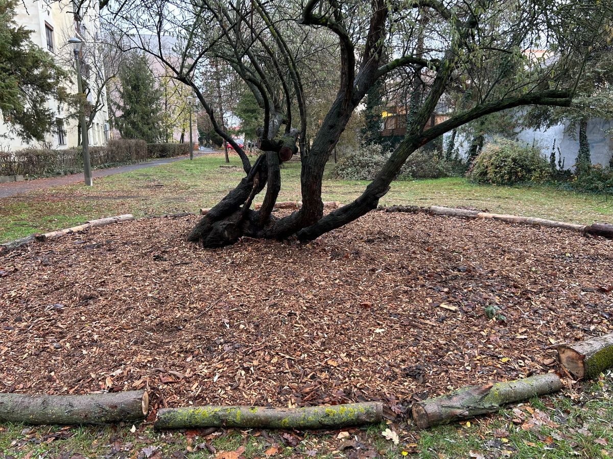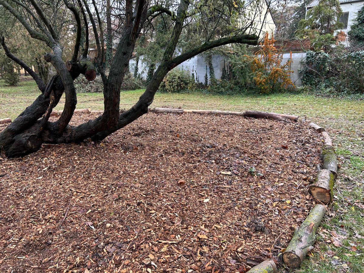 Szerda délelőtt a Hunyadivárosban jártunk. A Zászló utca felől, a Kiskunsági Nemzeti Park Igazgatósága mögötti zöld területen egy nagyon különleges fa áll, amely lényegében „új otthont” kapott. A fa környezetét aprított falevéllel vették be, amit – hogy azt a szél ne hordja el – lefedtek mulccsal, és jól elkerítették. Az avar helyben hagyása így megoldott, de mi célt szolgál ez?